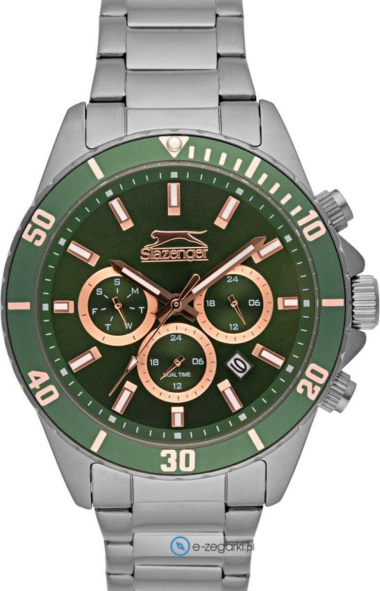 Zegarek męski SL.09.2091.2.03 marki Slazenger to dobre połączenie funkcjonalności a także ciekawego wzornictwa. Wysokiej jakości tarczę zegarka ozdobiono zielonym kolorem. Pokazana metodą analogową bieżąca godzina jest czytelna i prosta do odczytania. Koperta szeroka jest na 44 mm - ma okrągły kształt.