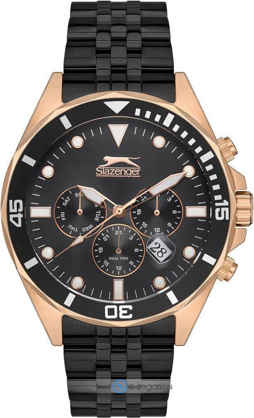 Zegarek męski SL.09.2130.2.03 marki Slazenger to idealna pozycja dla ludzi ceniących sobie dbałość o szczegóły jak również sprawne zachowanie mechanizmów. Wysokiej trwałości cyferblat zegarka pokryto czarnym kolorem. Zegarek ten pokazuje godzinę w formacie analogowym dzięki czemu odczyt jest bezproblemowy. Koperta jest pokryta kolorem różowo złotym szeroka jest na 46 mm - ma okrągły kształt.