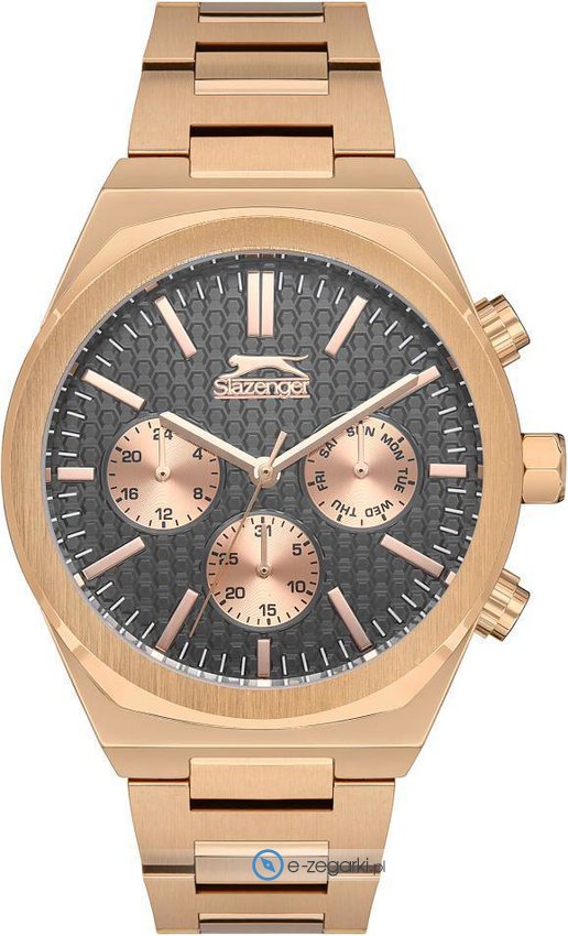 Męski zegarek Slazenger SL.09.2137.2.04 to zegarek, który dzięki swemu wzornictwu zawsze będzie prezentował się dobrze. Niestereotypowy wygląd zegarka osiągnięto także dzięki tarczy w kolorze szarym. Aktualna godzina przedstawiona jest w sposób analogowy co bez trudu pozwala ją odczytać. Koperta w barwach koloru różowo złotego szeroka jest na 44 mm - w kształcie okrągłym.