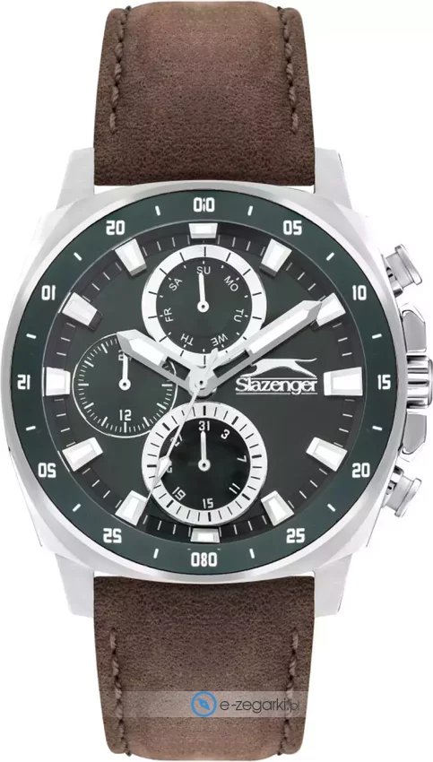 Model SL.09.2293.2.07 marki Slazenger to stylowy zegarek naręczny męski, który posiada pomysłowe rozwiązania i funkcje. Ciekawą stylistykę czasomierza uzyskano dzięki tarczy w kolorze zielonym. Godzina zaprezentowana jest w sposób analogowy co intuicyjnie pozwala ją odczytać. Koperta jest w kolorze stalowym szeroka jest na 44 mm - w kształcie okrągłym.
