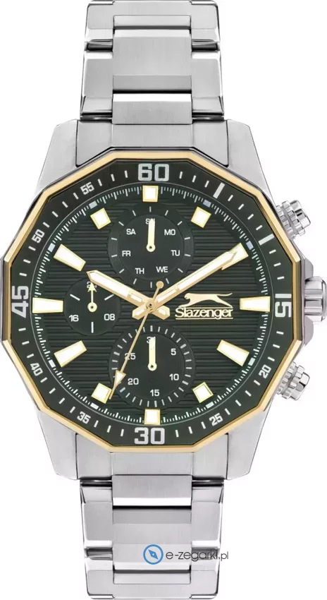 Męski zegarek Slazenger SL.09.2297.2.07 to zegarek, który dzięki swemu wzornictwu zawsze będzie prezentował się dobrze. Charakteru nadaje wysokiej jakości cyferblat w kolorze zielonym. Aktualna godzina zaprezentowana jest w sposób analogowy co bez trudu pozwala ją odczytać. Koperta jest w kolorze stalowym szeroka jest na 44 mm - ma okrągły kształt.