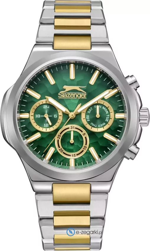 Zegarek męski SL.09.2364.2.01 marki Slazenger to ciekawa propozycja dla osób ceniących sobie dbałość o szczegóły oraz sprawne zachowanie mechanizmów. Charakterystyczną budowę zegarka uzyskano z pomocą tarczy w kolorze zielonym. Zegarek ten prezentuje godzinę w formacie analogowym dzięki temu odczyt jest intuicyjny. Koperta szeroka jest na 42 mm - wyróżnia się okrągłym kształtem.