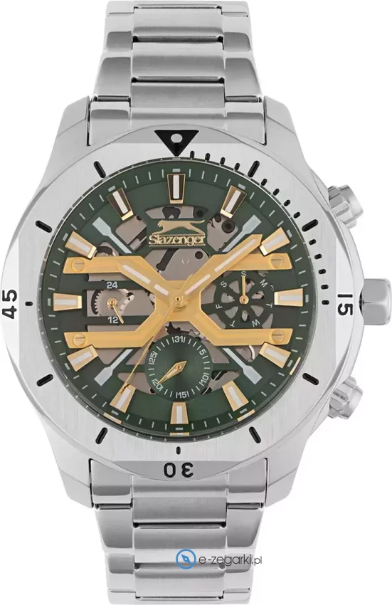 Zegarek męski SL.09.2377.2.05 marki Slazenger to idealna pozycja dla ludzi ceniących sobie dbałość o detale oraz bezproblemowe działanie mechanizmów. Wysokiej jakości tarczę zegarka pokryto zielonym kolorem. Pokazana metodą analogową aktualna godzina jest czytelna i prosta do odczytania. Koperta jest ozdobiona kolorem stalowym szeroka jest na 44 mm - ma okrągły kształt.