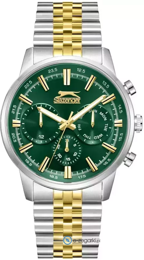 Model SL.09.2453.2.04 marki Slazenger to elegancki zegarek naręczny męski, który jest wyposażony w pomysłowe rozwiązania i funkcje. Wysokiej trwałości cyferblat zegarka pokryto zielonym kolorem. Zaprezentowana metodą analogową bieżąca godzina jest czytelna i łatwa do odczytania. Koperta jest w kolorze stalowym szeroka jest na 43 mm - wyróżnia się okrągłym kształtem.