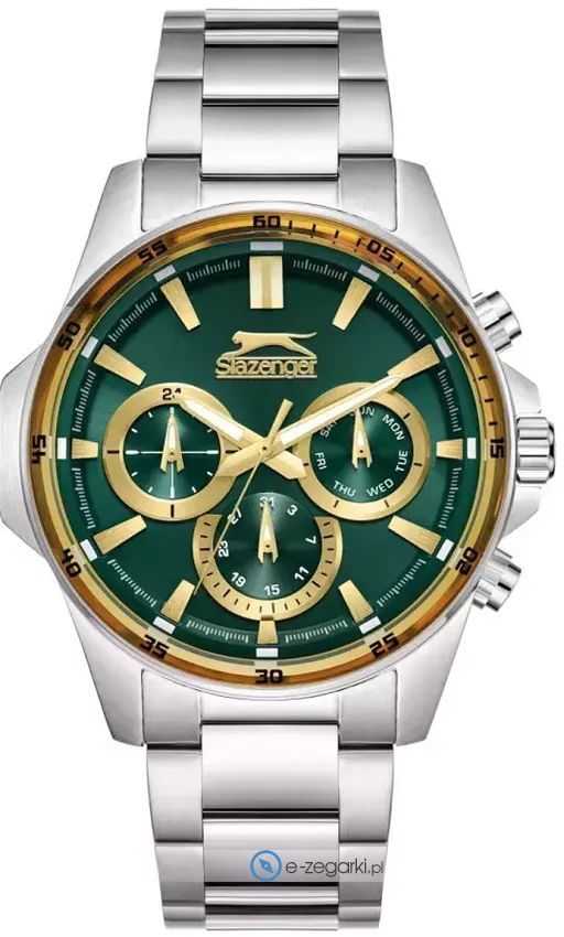 Model SL.09.2456.2.04 marki Slazenger to gustowny zegarek naręczny męski, który jest wyposażony w pomysłowe rozwiązania oraz funkcje. Stylu nadaje wysokiej jakości tarcza w kolorze zielonym. Zaprezentowana metodą analogową aktualna godzina jest czytelna i szybka do odczytania. Koperta jest pokryta kolorem stalowym szeroka jest na 43 mm - wyróżnia się okrągłym kształtem.