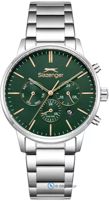 Męski zegarek Slazenger SL.09.2585.2.370 to zegarek, który dzięki swemu wzornictwu zawsze będzie prezentował się dobrze. Nieschematyczny wygląd zegarka osiągnięto m.in. poprzez cyferblat w kolorze zielonym. Godzina pokazywana jest w sposób analogowy co niezmiernie łatwo pozwala ją odczytać. Koperta została ozdobiona kolorem stalowym szeroka jest na 42 mm - w kształcie okrągłym.