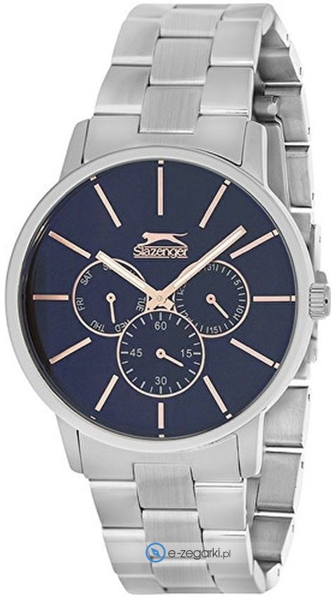 Model SL.09.6010.2.03 marki Slazenger to stylowy zegarek naręczny męski, który posiada pomysłowe rozwiązania i funkcje. Nieschematyczny wygląd czasomierza osiągnięto dzięki tarczy w kolorze granatowym. Koperta w odcieniach koloru stalowego szeroka jest na 42 mm - posiada okrągły kształt.