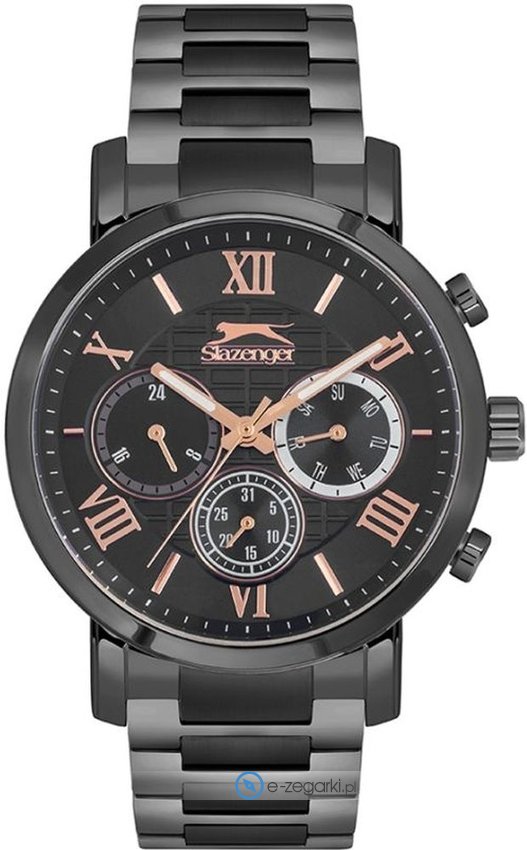 Model SL.09.6285.2.02 marki Slazenger to gustowny zegarek naręczny męski, który wyposażono w ciekawe rozwiązania i funkcje. Ciekawą konstrukcję zegarka uzyskano z pomocą tarczy w kolorze czarnym. Aktualna godzina przedstawiona jest w sposób analogowy co niezmiernie łatwo pozwala ją odczytać. Koperta jest pokryta kolorem stalowym szeroka jest na 44 mm - w kształcie okrągłym.