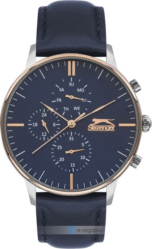 Model SL.09.6392.2.02 marki Slazenger to stylowy zegarek naręczny męski, który wyposażono w pomysłowe rozwiązania i funkcje. Atrakcyjny wygląd czasomierza osiągnięto także dzięki tarczy w kolorze niebieskim. Aktualna godzina pokazywana jest w sposób analogowy co intuicyjnie pozwala ją odczytać. Koperta jest w kolorze różowo złotym szeroka jest na 44 mm - charakteryzuje się okrągłym kształtem.