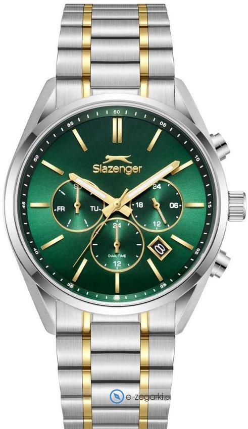 Męski zegarek Slazenger SL.9.2493.2.02 to zegarek, który dzięki swemu wzornictwu zawsze będzie prezentował się dobrze. Niebanalny wygląd zegarka uzyskano również dzięki tarczy w kolorze zielonym. Aktualna godzina pokazywana jest w sposób analogowy co niezmiernie łatwo pozwala ją odczytać. Koperta w odcieniach koloru srebrnego szeroka jest na 42 mm - posiada okrągły kształt.