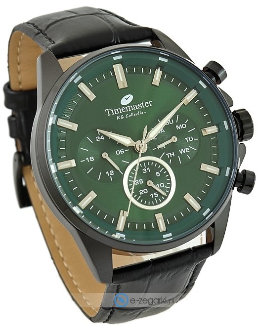 Model męski 271-04 z serii Timemaster marki Timemaster. Charakterystyczny wygląd czasomierza uzyskano również dzięki tarczy w kolorze zielonym. Aktualna godzina pokazywana jest w sposób analogowy co bez trudu pozwala ją odczytać. Koperta jest w kolorze czarnym szeroka jest na 47 mm oraz ma grubość 12 mm - wyróżnia się okrągłym kształtem.