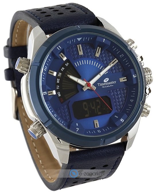 Zegarek 199-11 marki Timemaster to stylowy zegarek naręczny męski, który posiada pomysłowe rozwiązania oraz funkcje. Model ten należy do kolekcji Timemaster LCD. Charakterystyczny wygląd czasomierza osiągnięto także dzięki tarczy w kolorze granatowym. Godzina zaprezentowana jest w sposób analogowo - cyfrowy co intuicyjnie pozwala ją odczytać. Koperta została ozdobiona kolorem srebrnym szeroka jest na 48 mm oraz ma grubość 16 mm - w kształcie okrągłym.