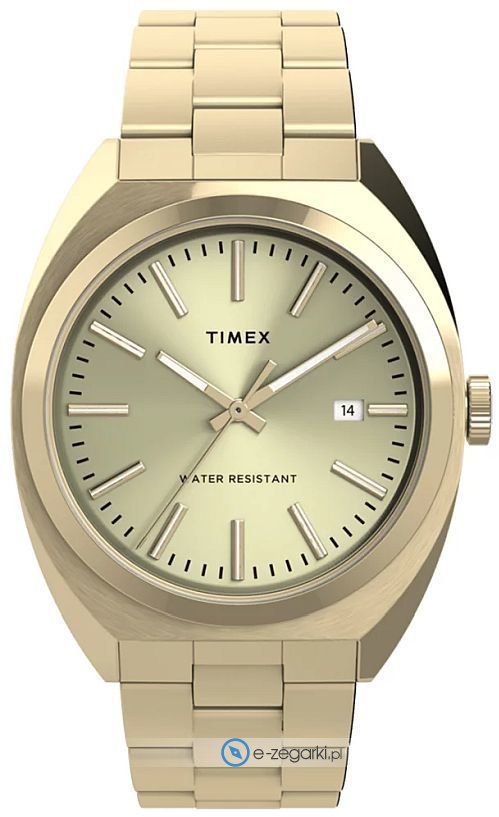 Zegarek męski TW2U15700 marki Timex to stylowe połączenie funkcjonalności oraz ciekawego designu. Atrakcyjny wygląd zegarka osiągnięto m.in. poprzez tarczę w kolorze złotym. Zaprezentowana metodą analogową bieżąca godzina jest czytelna i łatwa do odczytania. Koperta jest w kolorze złotym szeroka jest na 38 mm oraz ma grubość 11 mm.