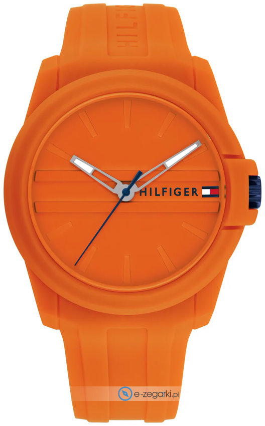 Model męski 1710597 marki Tommy Hilfiger z serii Tommy Hilfiger Austin. Charakterystyczny wygląd czasomierza uzyskano także dzięki tarczy w kolorze pomarańczowym. Aktualna godzina przedstawiona jest w sposób analogowy co bez trudu pozwala ją odczytać. Koperta została ozdobiona kolorem pomarańczowym szeroka jest na 44 mm oraz ma grubość 10 mm - charakteryzuje się okrągłym kształtem.