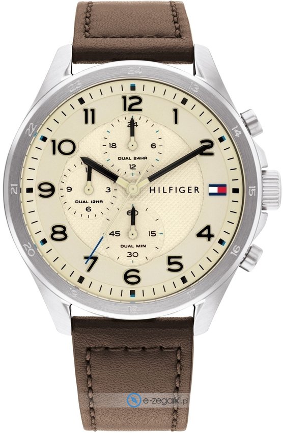 Męski zegarek Tommy Hilfiger 1792003 to zegarek, który dzięki swemu wzornictwu zawsze będzie prezentował się dobrze. Wysokiej jakości cyferblat zegarka ozdobiono beżowym kolorem. Pokazana metodą analogową aktualna godzina jest czytelna i szybka do sprawdzenia. Koperta jest w kolorze stalowym szeroka jest na 45 mm oraz ma grubość 11 mm - cechuje się okrągłym kształtem.