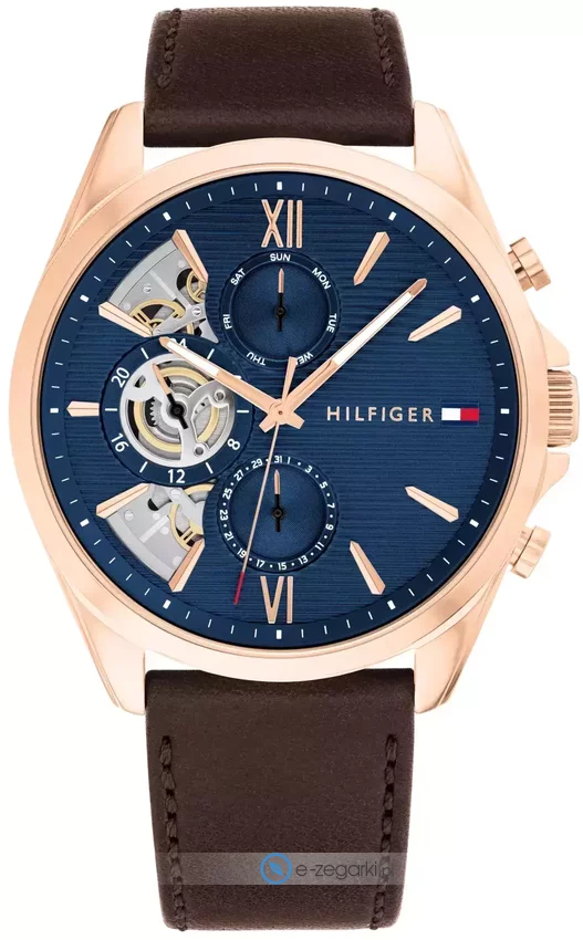 Zegarek męski 1710645 należy do kolekcji Tommy Hilfiger Baker marki Tommy Hilfiger. Cyferblat zegarka jest w kolorze granatowym. Zegarek ten pokazuje godzinę w formacie analogowym dzięki czemu odczyt jest bezproblemowy. Koperta jest w kolorze różowo złotym szeroka jest na 44 mm oraz ma grubość 10 mm - w kształcie okrągłym.