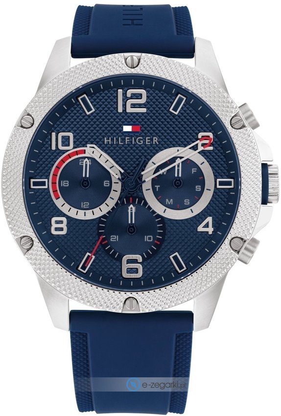 Męski zegarek 1792027 z kolekcji Tommy Hilfiger Blaze marki Tommy Hilfiger to połączenie stylu oraz nieprzeciętnych mechanizmów. Wysokiej trwałości tarczę zegarka ozdobiono niebieskim kolorem. Zegarek ten pokazuje godzinę w formacie analogowym dzięki temu odczyt jest intuicyjny. Koperta została pokryta kolorem stalowym szeroka jest na 46 mm - w kształcie okrągłym.