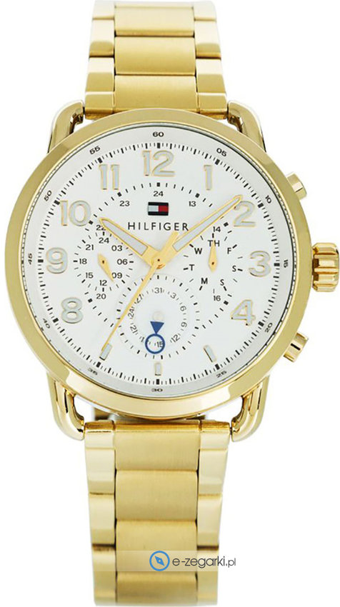 Zegarek 1791455 marki Tommy Hilfiger to elegancki zegarek naręczny męski, który posiada pomysłowe rozwiązania i funkcje. Model ten jest z kolekcji Tommy Hilfiger Briggs. Niebanalny wygląd czasomierza osiągnięto m.in. poprzez tarczę w kolorze białym. Zegarek ten pokazuje godzinę w formacie analogowym dzięki temu odczyt jest bardzo łatwy. Koperta jest ozdobiona kolorem złotym szeroka jest na 46 mm oraz ma grubość 10 mm - wyróżnia się okrągłym kształtem.