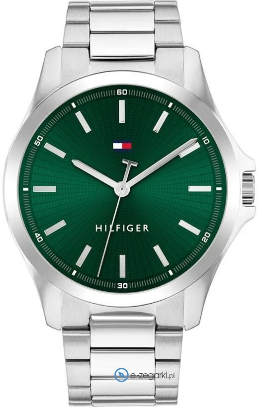 Męski zegarek 1710672 z serii Tommy Hilfiger Bruce marki Tommy Hilfiger to połączenie smaku i oryginalnych funkcji. Wysokiej trwałości tarczę zegarka pokryto zielonym kolorem. Zegarek ten pokazuje godzinę w formacie analogowym dzięki czemu odczyt jest bezproblemowy. Koperta w odcieniach koloru stalowego szeroka jest na 43 mm - wyróżnia się okrągłym kształtem.