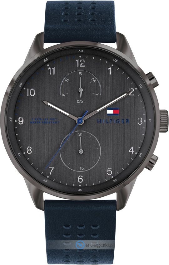 Zegarek męski 1791578 marki Tommy Hilfiger to dobre połączenie funkcjonalności oraz modnego wzornictwa. Charakterystyczny wygląd czasomierza uzyskano poprzez tarczę w kolorze granatowym. Koperta w barwach koloru czarnego szeroka jest na 44 mm oraz ma grubość 10 mm - wyróżnia się okrągłym kształtem.