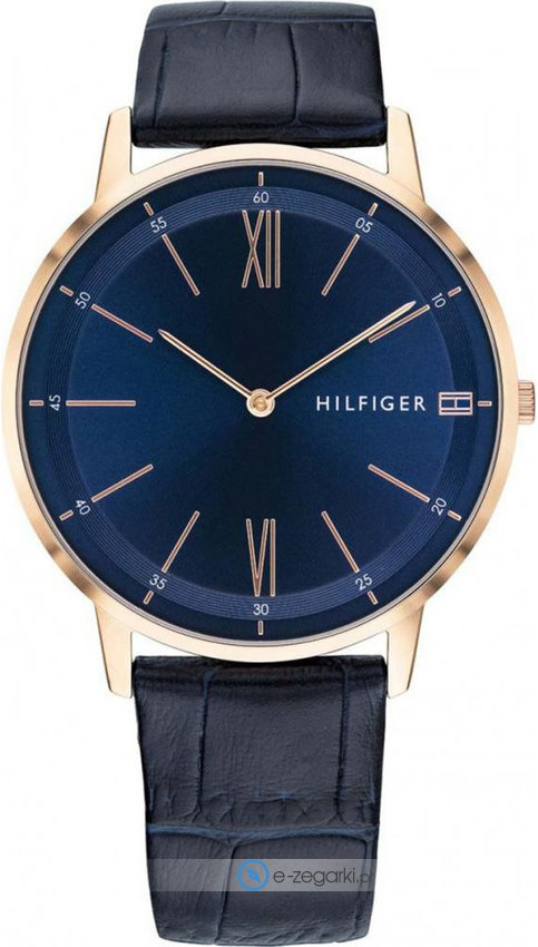 Zegarek męski 1791515 marki Tommy Hilfiger to stylowe połączenie funkcjonalności a także modnego wzornictwa. Model ten w gamie pozostałych zegarków tego producenta występuje w serii Tommy Hilfiger Cooper. Niebanalny wygląd czasomierza osiągnięto również dzięki tarczy w kolorze granatowym. Zegarek ten prezentuje godzinę w formacie analogowym dzięki temu odczyt jest bezproblemowy. Koperta jest w kolorze różowo złotym szeroka jest na 40 mm oraz ma grubość 6 mm - ma okrągły kształt.