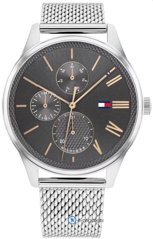Zegarek męski 1791846 marki Tommy Hilfiger to stylowe połączenie funkcjonalności a także modnego wzornictwa. Model ten w gamie innych zegarków tego producenta występuje w serii Tommy Hilfiger Damon. Ciekawą budowę czasomierza uzyskano z pomocą tarczy w kolorze szarym. Zegarek ten prezentuje godzinę w formacie analogowym dzięki czemu odczyt jest bezproblemowy. Koperta została ozdobiona kolorem stalowym szeroka jest na 45 mm oraz ma grubość 13 mm - cechuje się okrągłym kształtem.
