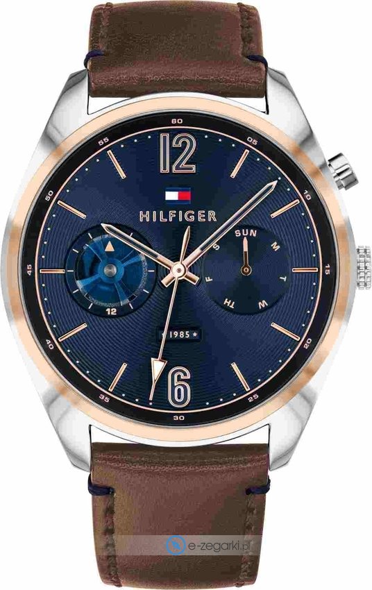 Zegarek męski 1791549 marki Tommy Hilfiger z rodziny Tommy Hilfiger Deacan. Styl zapewnia wysokiej jakości cyferblat w kolorze granatowym. Koperta szeroka jest na 44 mm oraz ma grubość 10 mm - posiada okrągły kształt.