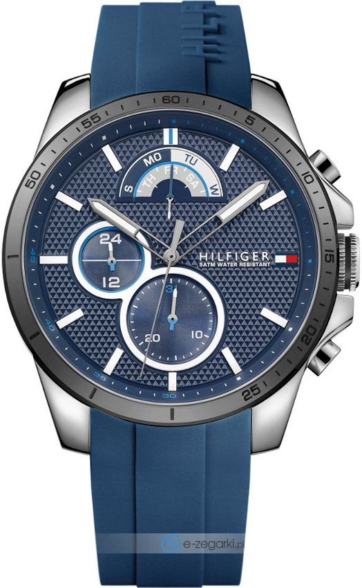 Tommy Hilfiger 1791350 to męski zegarek przeznaczony dla osób szukających zegarka z serii Tommy Hilfiger Decker. Wysokiej trwałości cyferblat zegarka pokryto granatowym kolorem. Pokazana metodą analogową bieżąca godzina jest czytelna i szybka do sprawdzenia. Koperta jest pokryta kolorem srebrnym szeroka jest na 46 mm oraz ma grubość 11 mm - ma okrągły kształt.