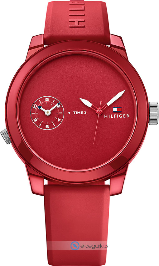 Męski zegarek 1791323 z kolekcji Tommy Hilfiger Denim marki Tommy Hilfiger to połączenie estetyki oraz nieprzeciętnych mechanizmów. Ciekawą konstrukcję czasomierza osiągnięto dzięki tarczy w kolorze ciemnym. Pokazana metodą analogową aktualna godzina jest czytelna i łatwa do odczytania. Koperta w odcieniach koloru czerwonego szeroka jest na 44 mm oraz ma grubość 11 mm - cechuje się okrągłym kształtem.
