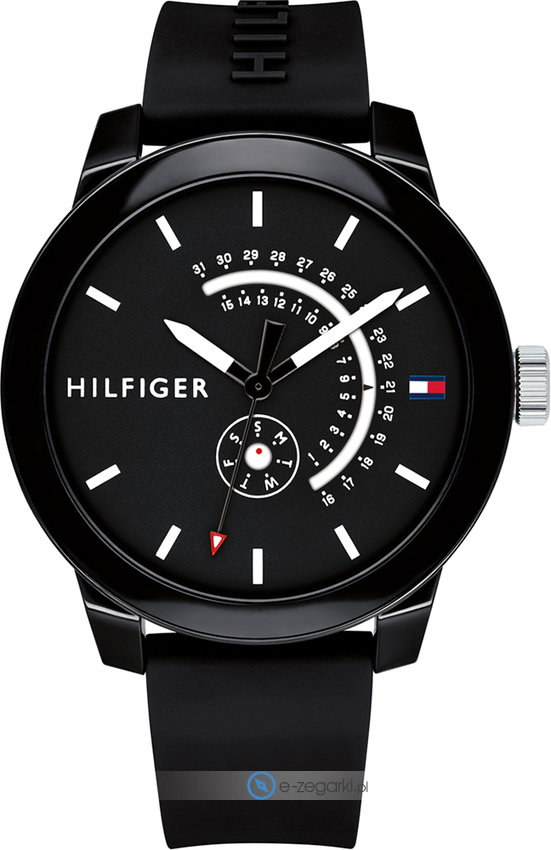 Model męski 1791483 marki Tommy Hilfiger należy do serii Tommy Hilfiger Denim. Charakteru dodaje wysokiej jakości cyferblat w kolorze czarnym. Aktualna godzina zaprezentowana jest w sposób analogowy co niezmiernie łatwo pozwala ją odczytać. Koperta została ozdobiona kolorem czarnym szeroka jest na 44 mm oraz ma grubość 11 mm - charakteryzuje się okrągłym kształtem.