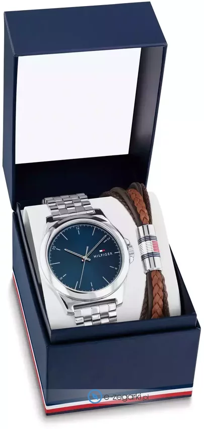 Zegarek 2770173 marki Tommy Hilfiger to gustowny zegarek naręczny męski, który posiada ciekawe rozwiązania i funkcje. Model ten występuje w kolekcji Tommy Hilfiger Gift Set. Nieschematyczny wygląd zegarka osiągnięto m.in. poprzez cyferblat w kolorze granatowym. Godzina prezentowana jest w sposób analogowy co niezmiernie łatwo pozwala ją odczytać. Koperta w barwach koloru stalowego szeroka jest na 42 mm - posiada okrągły kształt.