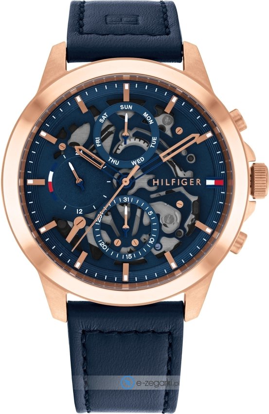 Męski zegarek 1710475 z kolekcji Tommy Hilfiger Henry marki Tommy Hilfiger to połączenie stylu oraz nieprzeciętnych funkcji. Styl zapewnia wysokiej klasy tarcza w kolorze niebieskim. Zaprezentowana metodą analogową bieżąca godzina jest czytelna i łatwa do odczytania. Koperta jest pokryta kolorem różowo złotym szeroka jest na 44 mm - wyróżnia się okrągłym kształtem.