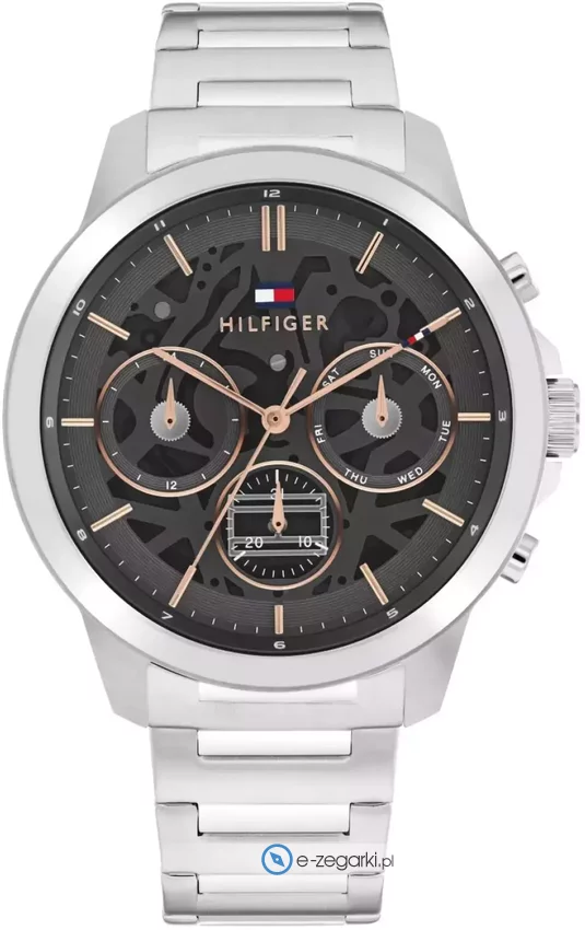 Zegarek męski 1710683 marki Tommy Hilfiger to idealne połączenie funkcjonalności a także ciekawego designu. Model ten zalicza się do kolekcji Tommy Hilfiger Henry. Charakter zapewnia wysokiej jakości cyferblat w kolorze szarym. Zaprezentowana metodą analogową aktualna godzina jest czytelna i łatwa do odczytania. Koperta jest w kolorze stalowym szeroka jest na 44 mm oraz ma grubość 11 mm - w kształcie okrągłym.