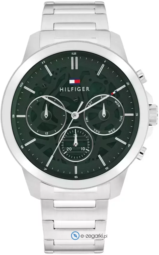 Zegarek 1710686 marki Tommy Hilfiger to stylowy zegarek naręczny męski, który jest wyposażony w ciekawe rozwiązania oraz funkcje. Model ten jest z kolekcji Tommy Hilfiger Henry. Stylu dodaje wysokiej klasy cyferblat w kolorze zielonym. Aktualna godzina zaprezentowana jest w sposób analogowy co bez trudu pozwala ją odczytać. Koperta została pokryta kolorem stalowym szeroka jest na 44 mm oraz ma grubość 11 mm - ma okrągły kształt.