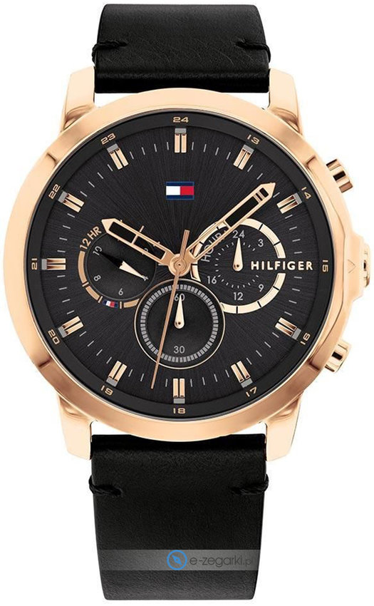 Zegarek 1791798 marki Tommy Hilfiger to gustowny zegarek naręczny męski, który jest wyposażony w ciekawe rozwiązania i funkcje. Model ten występuje w kolekcji Tommy Hilfiger Jameson. Tarcza zegarka jest w kolorze czarnym. Zaprezentowana metodą analogową bieżąca godzina jest czytelna i łatwa do odczytania. Koperta jest w kolorze różowo złotym szeroka jest na 46 mm oraz ma grubość 10 mm - w kształcie okrągłym.