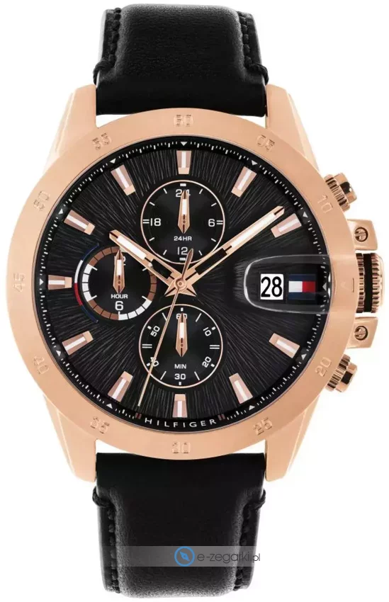 Zegarek męski 1792194 z serii Tommy Hilfiger Jameson marki Tommy Hilfiger. Charakterystyczny wygląd zegarka osiągnięto m.in. poprzez cyferblat w kolorze czarnym. Godzina prezentowana jest w sposób analogowy co intuicyjnie pozwala ją odczytać. Koperta w barwach koloru różowo złotego szeroka jest na 43 mm oraz ma grubość 11 mm - cechuje się okrągłym kształtem.