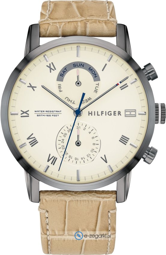 Tommy Hilfiger 1710399 to męski zegarek przeznaczony dla osób szukających zegarka z kolekcji Tommy Hilfiger Kane. Niestereotypowy wygląd czasomierza uzyskano również dzięki tarczy w kolorze beżowym. Aktualna godzina zaprezentowana jest w sposób analogowy co niezmiernie łatwo pozwala ją odczytać. Koperta szeroka jest na 44 mm oraz ma grubość 11 mm - wyróżnia się okrągłym kształtem.