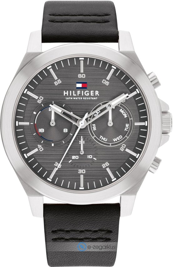 Męski zegarek 1710521 z kolekcji Tommy Hilfiger Lance marki Tommy Hilfiger to połączenie estetyki oraz ciekawych funkcji. Charakteru nadaje wysokiej jakości cyferblat w kolorze szarym. Godzina prezentowana jest w sposób analogowy co intuicyjnie pozwala ją odczytać. Koperta w barwach koloru stalowego szeroka jest na 46 mm - cechuje się okrągłym kształtem.
