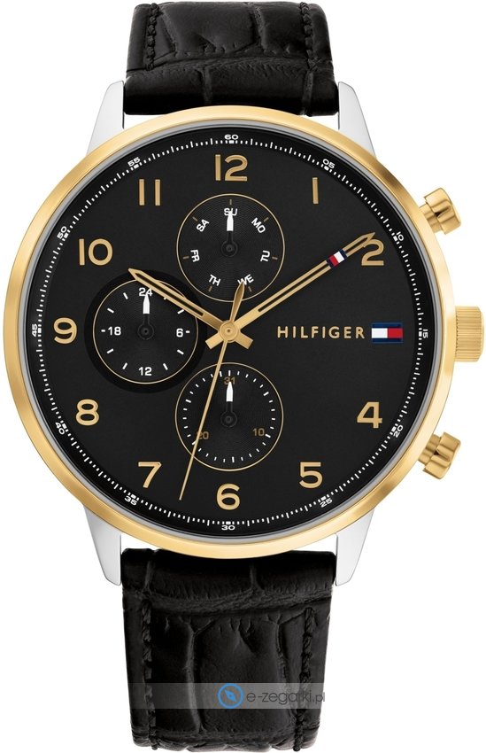 Zegarek męski 1791986 marki Tommy Hilfiger to dobre połączenie funkcjonalności a także ciekawego designu. Model ten należy do serii Tommy Hilfiger Leonard. Styl zapewnia wysokiej jakości cyferblat w kolorze czarnym. Godzina zaprezentowana jest w sposób analogowy co intuicyjnie pozwala ją odczytać. Koperta w odcieniach koloru złotego szeroka jest na 44 mm oraz ma grubość 11 mm - w kształcie okrągłym.