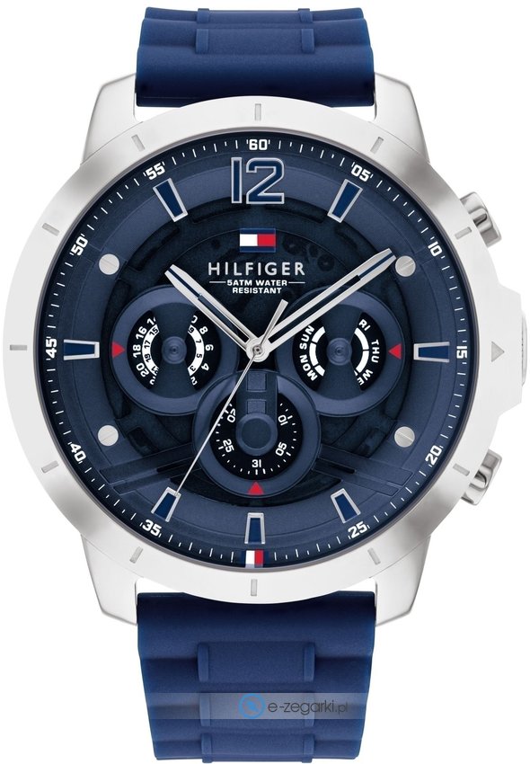 Zegarek męski 1710489 z kolekcji Tommy Hilfiger Luca marki Tommy Hilfiger. Wysokiej jakości tarczę zegarka pokryto granatowym kolorem. Aktualna godzina pokazywana jest w sposób analogowy co niezmiernie łatwo pozwala ją odczytać. Koperta jest w kolorze stalowym szeroka jest na 50 mm oraz ma grubość 12 mm - posiada okrągły kształt.