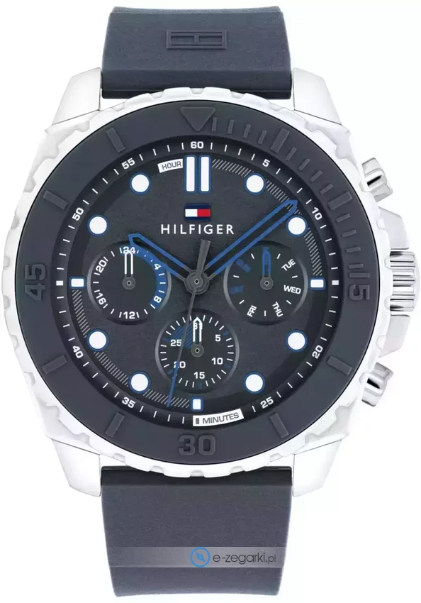 Zegarek męski 1710687 marki Tommy Hilfiger to dobre połączenie funkcjonalności oraz ciekawego designu. Model ten w gamie pozostałych zegarków tego producenta występuje w serii Tommy Hilfiger Morgan. Tarcza zegarka jest w kolorze granatowym. Aktualna godzina zaprezentowana jest w sposób analogowy co niezmiernie łatwo pozwala ją odczytać. Koperta szeroka jest na 48 mm oraz ma grubość 13 mm - charakteryzuje się okrągłym kształtem.