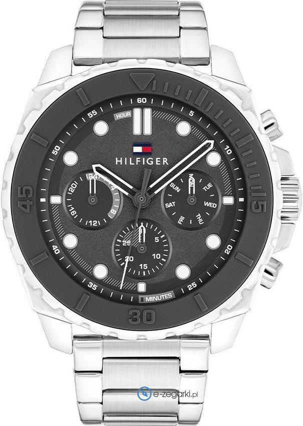 Męski zegarek 1710689 z serii Tommy Hilfiger Morgan marki Tommy Hilfiger to połączenie estetyki oraz nowatorskich funkcji. Nieschematyczny wygląd zegarka osiągnięto m.in. poprzez cyferblat w kolorze szarym. Aktualna godzina pokazywana jest w sposób analogowy co intuicyjnie pozwala ją odczytać. Koperta jest w kolorze szarym szeroka jest na 48 mm oraz ma grubość 13 mm - w kształcie okrągłym.