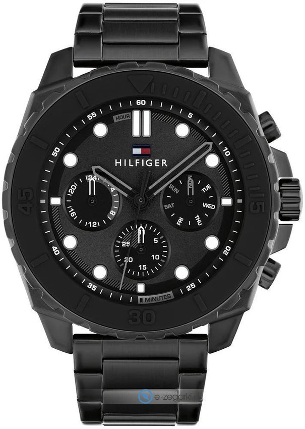 Zegarek męski 1710690 marki Tommy Hilfiger z serii Tommy Hilfiger Morgan. Stylu nadaje wysokiej jakości tarcza w kolorze czarnym. Aktualna godzina przedstawiona jest w sposób analogowy co intuicyjnie pozwala ją odczytać. Koperta w odcieniach koloru czarnego szeroka jest na 48 mm oraz ma grubość 13 mm - cechuje się okrągłym kształtem.