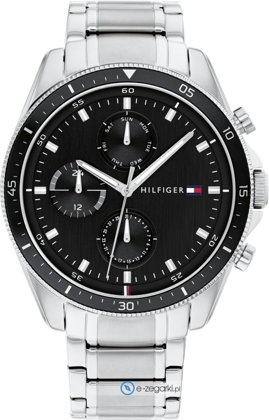Męski zegarek 1791835 z kolekcji Tommy Hilfiger Parker marki Tommy Hilfiger to połączenie estetyki oraz oryginalnych funkcji. Ciekawą stylistykę czasomierza uzyskano z pomocą tarczy w kolorze czarnym. Zaprezentowana metodą analogową bieżąca godzina jest czytelna i prosta do odczytania. Koperta jest pokryta kolorem stalowym szeroka jest na 44 mm oraz ma grubość 11 mm - w kształcie okrągłym.