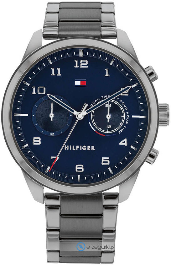 Tommy Hilfiger 1791782 to męski zegarek kierowany dla osób szukających zegarka z serii Tommy Hilfiger Patrick. Niebanalny wygląd czasomierza osiągnięto również dzięki tarczy w kolorze granatowym. Zaprezentowana metodą analogową bieżąca godzina jest czytelna i prosta do odczytania. Koperta w barwach koloru szarego szeroka jest na 44 mm oraz ma grubość 11 mm - w kształcie okrągłym.