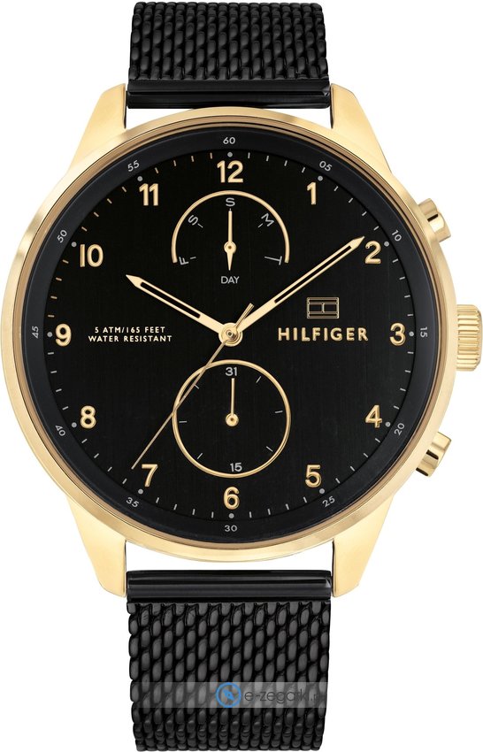 Model 1791580 marki Tommy Hilfiger to stylowy zegarek naręczny męski, który jest wyposażony w ciekawe rozwiązania oraz funkcje. Wysokiej jakości tarczę zegarka ozdobiono czarnym kolorem. Koperta jest ozdobiona kolorem złotym szeroka jest na 44 mm oraz ma grubość 10 mm - cechuje się okrągłym kształtem.