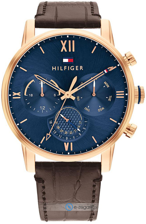 Zegarek męski 1791933 należy do serii Tommy Hilfiger Sullivan marki Tommy Hilfiger. Niebanalną budowę zegarka uzyskano z pomocą tarczy w kolorze granatowym. Aktualna godzina zaprezentowana jest w sposób analogowy co intuicyjnie pozwala ją odczytać. Koperta jest pokryta kolorem różowo złotym szeroka jest na 44 mm oraz ma grubość 11 mm - w kształcie okrągłym.