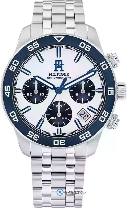 Tommy Hilfiger 1792157 - męski zegarek przeznaczony dla osób szukających zegarka z serii Tommy Hilfiger TH85 Chrono. Nieschematyczny wygląd czasomierza uzyskano również dzięki tarczy w kolorze białym. Zaprezentowana metodą analogową bieżąca godzina jest czytelna i łatwa do odczytania. Koperta jest w kolorze srebrnym szeroka jest na 41 mm oraz ma grubość 12 mm - ma okrągły kształt.