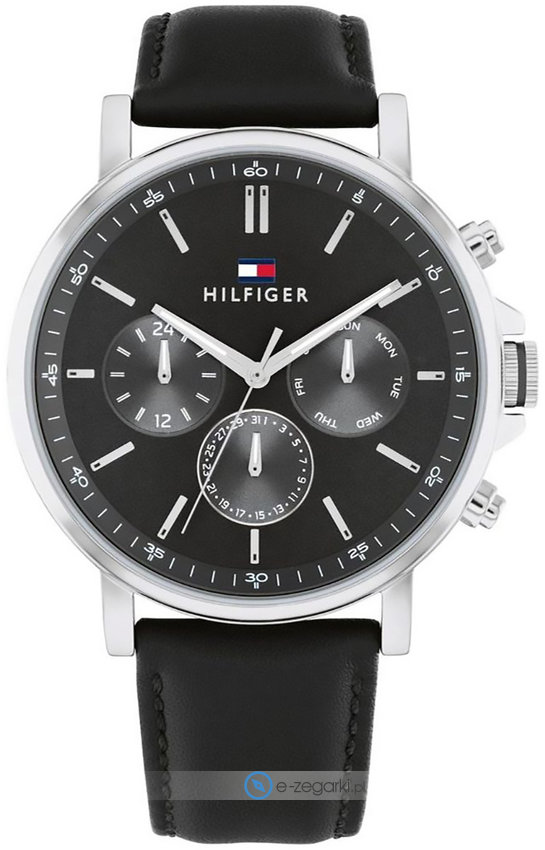 Zegarek męski 1710586 marki Tommy Hilfiger to stylowe połączenie funkcjonalności oraz modnego designu. Model ten zalicza się do serii Tommy Hilfiger Tyson. Wysokiej trwałości cyferblat zegarka pokryto czarnym kolorem. Pokazana metodą analogową aktualna godzina jest czytelna i szybka do sprawdzenia. Koperta jest w kolorze stalowym szeroka jest na 44 mm oraz ma grubość 10 mm - ma okrągły kształt.