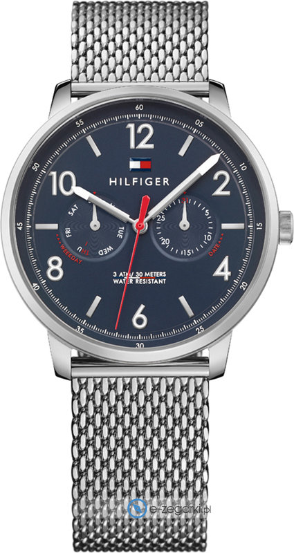 Zegarek męski 1791354 marki Tommy Hilfiger to dobre połączenie funkcjonalności i modnego designu. Model ten w gamie innych zegarków tego producenta występuje w serii Tommy Hilfiger Will. Niebanalną budowę zegarka osiągnięto z pomocą tarczy w kolorze granatowym. Koperta jest ozdobiona kolorem stalowym szeroka jest na 40 mm oraz ma grubość 12 mm - ma okrągły kształt.